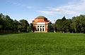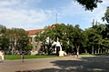 穿过二校门是一条约150米长的林荫路,尽头正前方一片青绿的长方形草坪,围绕草坪是一群肃穆庄重的建筑,这便是大礼堂区。
