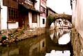 周庄因河成街,依河筑屋,桥街相连,虽然历经沧桑,仍完整地保存着原有的水乡古镇的风貌和格局,宛如一颗镶嵌在淀山湖畔的明珠。周庄之美,首先在于水,水是古镇的灵魂所在,有“镇为泽国,四面环水”之说,两横两纵的河流在此形成“井”字形从镇中穿过,水景如诗如画。古镇内河道呈井字型,有河有街必有桥,河道上横跨14座建于元、明、清代的极具特色的古桥,游人乘坐吴中舟楫,穿梭于周庄古镇的水道之中,偶尔彩虹飞架,偶尔石门洞开,古景依依,水风习习,令人寻味。